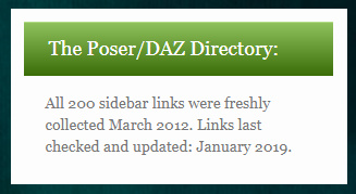 All of the sidebar Web links on this Poser/DAZ blog have been checked by hand, and cleaned and/or updated if needed. New Web links will be added to the Directory over the coming weeks and months.