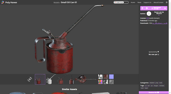 From South Africa, the new Poly Haven. A library website of free CC-Zero Blender assets with, at present, what appears to be some quality-control. A test of a small oil-can gave me an open public download (no sign-up needed). The polished and roomy new site seems to be from a small group of young Blender enthusiasts, who plan to run on a mix of crowdfunding and ads. It’s crowdfunding now.