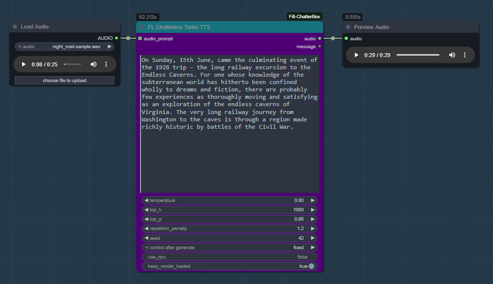 4. Get ComfyUI_Fill-ChatterBox’s sample .JSON workflow from here and load it in ComfyUI. You’ll see you have a new node for running Turbo, offering much the same adjustable parameters as the regular Chatterbox.