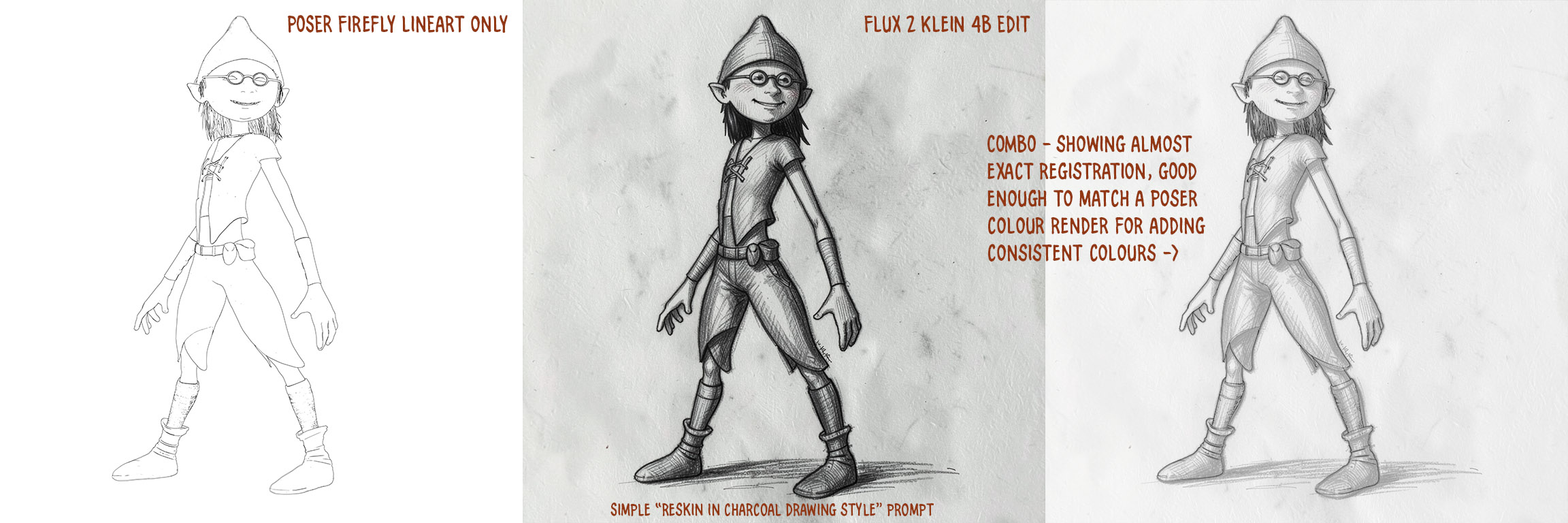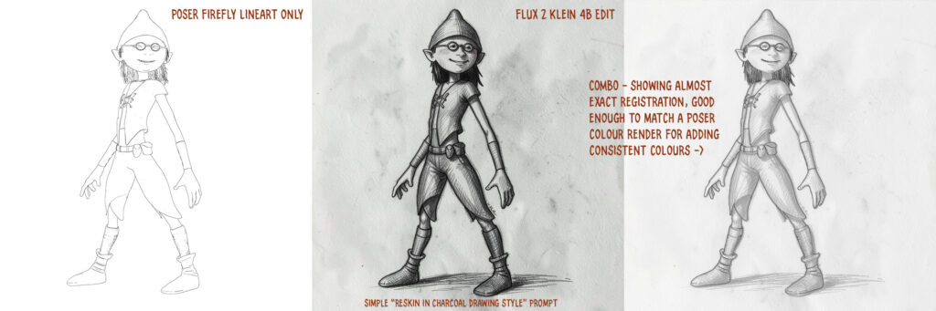 I made an initial basic test with the new Flux 2 Klein 4B, using it on a simple Firefly lineart-only render from Poser. Flux 2 Klein 4B is different from the recent and comparable Z-Image Turbo, in that it’s also a lightweight local Edit model as well as a prompt-to-image model. That means you can feed it an image and tell it to e.g. “Reskin this image in a charcoal sketch style”. And in ten seconds (on a 3060 12Gb card), out it pops. Far faster than the old Flux Kontext.
