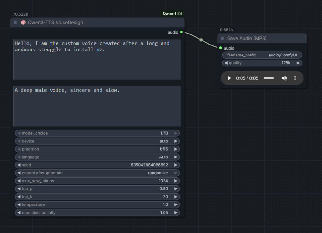 The basic requirements of Qwen3 TTS are compatible with a ComfyUI portable install — Python 3.8 or higher, PyTorch 2.0 or higher, so the above custom node set won’t bjork your PyTorch by trying to upgrade it. Beware others similar custom nodes for Qwen3 TTS in ComfyUI that will try to upgrade Pytorch to 2.9 (not good, for a portable Comfy).