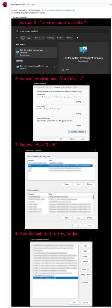 5. These Custom Nodes require a download of SoX which is an .EXE installer. Sox is a venerable freeware sound-exchange code library, kind of like ImageMagik… but for sound. After install you must add it to your Windows PATH. Thanks to Promethean Dante for the fix here…