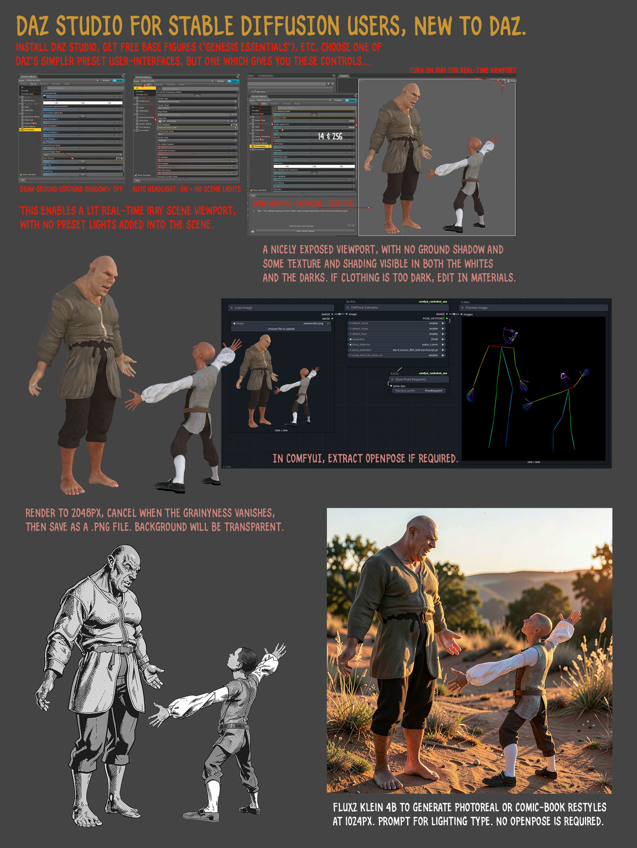 Things change here (expressions, head-angle, hair added), but it’s possible to prompt to get more of a 1:1 match. Thus enabling re-colouring with the DAZ render in Photoshop, for consistent colouring in comics.