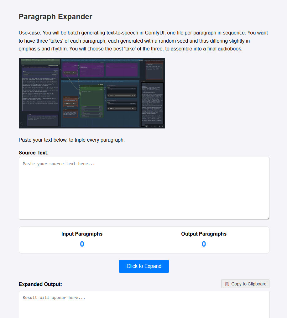 The idea of Paragraph Tripler is that you want three audio ‘takes’ of each paragraph or ‘chunk’ of your source text. Thus you need to duplicate each paragraph, so that it’s three identical paragraphs one after the other. Each duplicate then has a different random seed for the TTS generation. Once all the audio files are output, you select the best ‘take’ of each set of three, to assemble into the final audiobook.