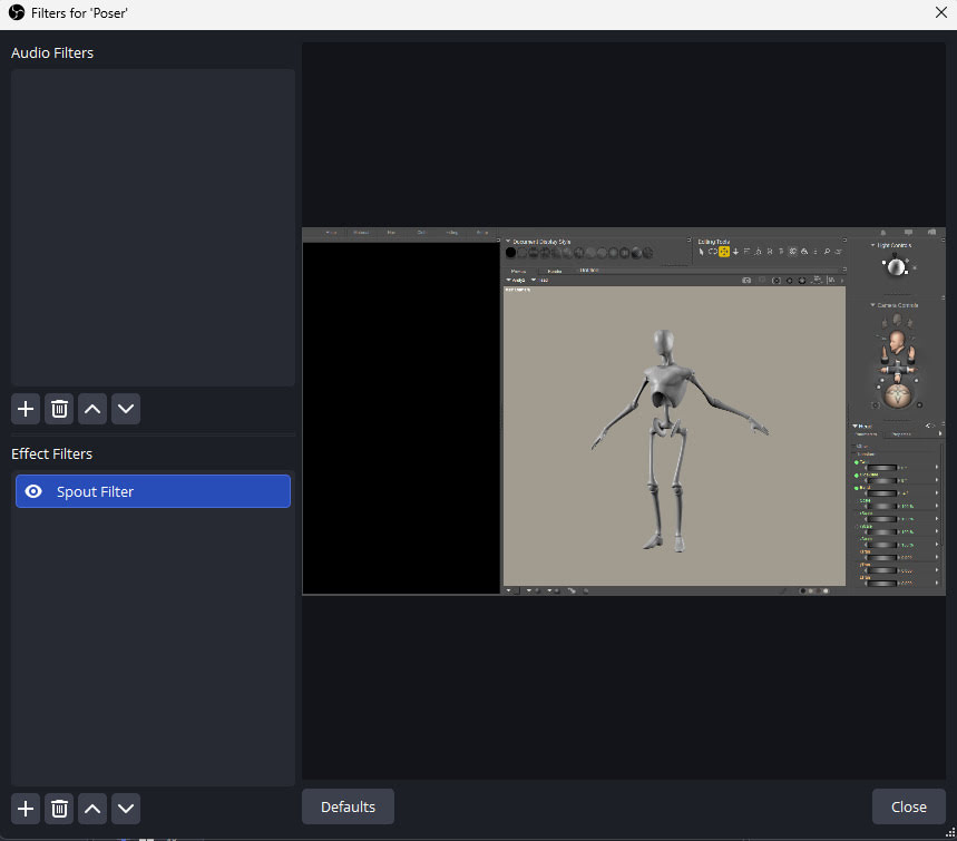 2. OBS has a free Spout 2 plugin which grabs just the target window’s video feed for Spout. Spout intercepts the video directly on the graphics processor GPU, and thus there’s no grinding heavy-lifting of rendered video files. Thus the video feed gets quickly pushed from one software to another.