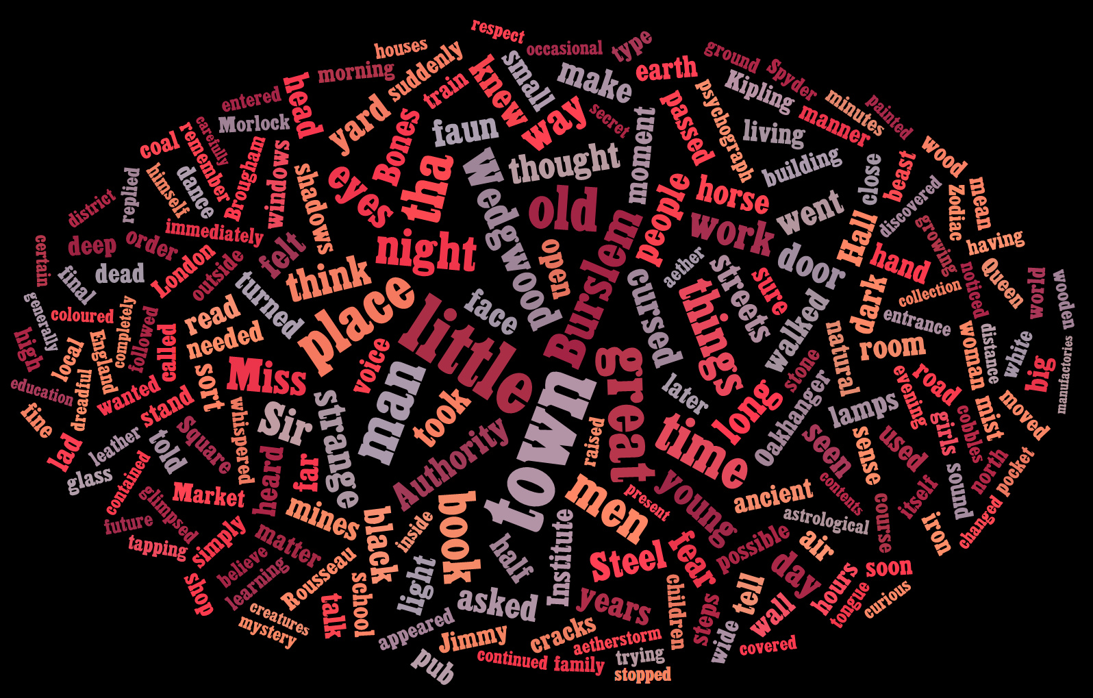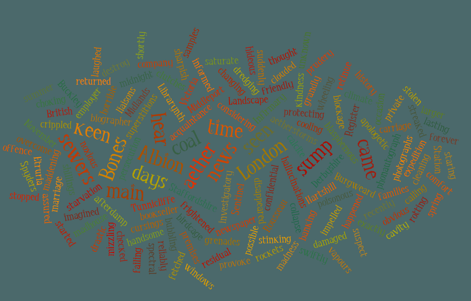 Two “word clouds” for the North Staffordshire novel The Spyders of Burslem. Click the picture for the full-size version…