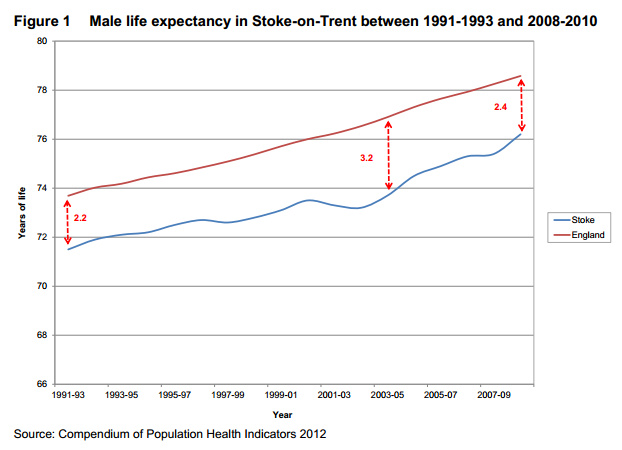 “Male life expectancy at birth in Stoke-on-Trent increased from 76.5 years in 2009-2011 to 76.7 years in 2010-2012.” — Joint Strategic Needs Assessment, Stoke-on-Trent City Council. Earlier male life expectancy figures are given in this graph from another Stoke-on-Trent City Council research document…