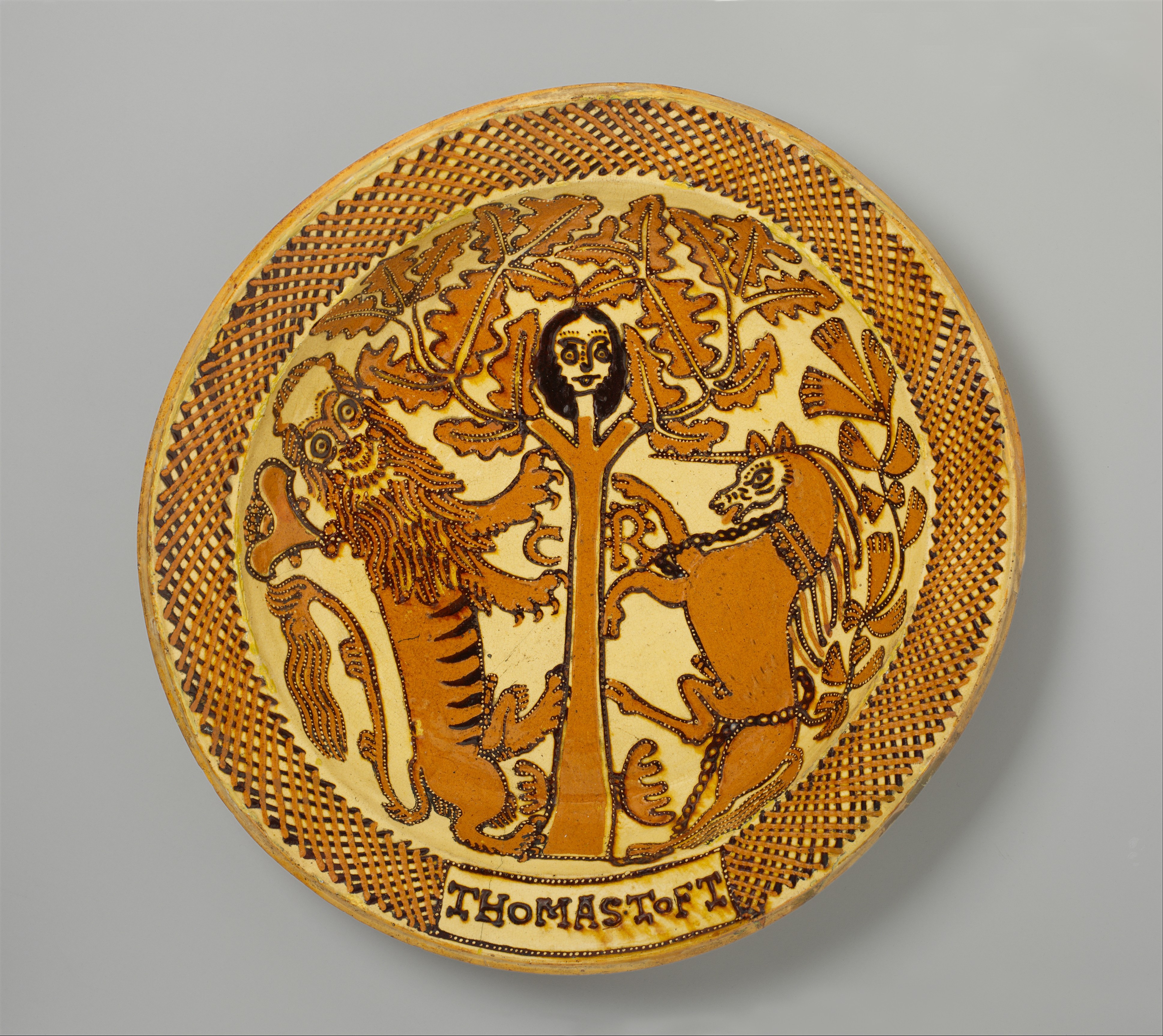 A curious Toft plate from North Staffordshire, circa 1680. The imagery relates to the popular belief that King Charles II hid in an oak tree to escape the puritans of Oliver Cromwell, but it also seems to partake of the deeper Anglo-Saxon ‘Dream of the Rood’ tradition that conflated Christ, the cross and native trees. Since Charles is not just in the oak tree, but is the tree.
