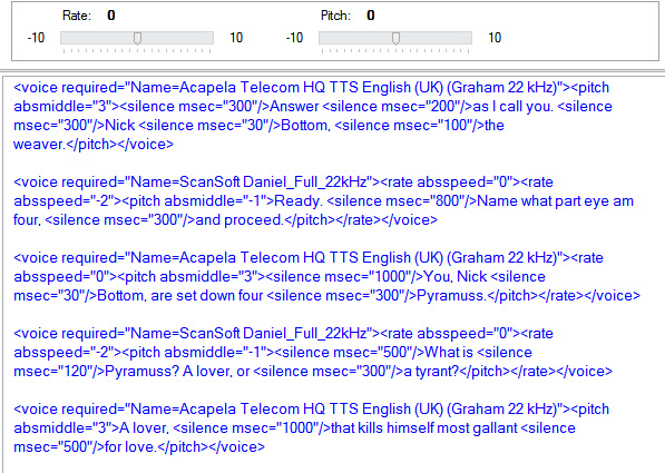 Balabolka’s “Direct Speech” and XML tags markup option can help you set up a stage-play -like script, in which there are different voices speaking in the same document. So you could, theoretically, have a Scot talking to someone from the Black Country. Here is an example of a coded script containing a few lines from A Midsummer Night’s Dream, and showing voice changes, pauses and pitch/speed shifts…