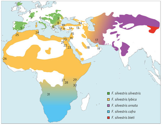 The first major [domestication] event was probably in the Fertile Crescent about 7,500 years ago, from wildcats originating in Anatolia. “Cats can then be seen moving with human populations as early as 5,000 to 6,000 years ago, as farmers spread from the Near East into Europe, and also with seafaring communities,” […] “Cats appear to have traveled along maritime trade routes … The second major wave of domestication occurred in the Greek and Roman periods, when a fad for Egyptian cats led to a movement of domestic cats descended from North African Felis silvestris lybica to Europe. … “The fad for Egyptian cats very quickly spread through the ancient Greek and Roman world, and even much further afield [specifically] the presence of the Egyptian lineage IV-C1 [cats] at the Viking port of Ralswiek 7–11th century AD”.