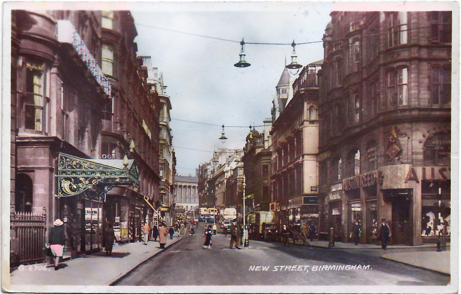 Looking west up New St., probably 1930s. The Midland Hotel (now Waterstones bookshop) on the left with the green iron canopy. Opposite, “Cornish’s” bookshop was. Follow the sight-line of the Austin Reed sign along the shopfronts a little, to glimpse the oblong street-sign plaque indicating Needless Alley. Postcard newly colorised.