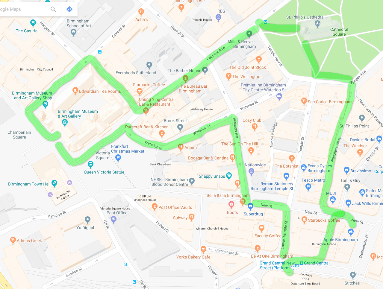 Today the best three-hour circular stroll from New St. station, keeping to the most interesting Victorian and Edwardian bits, would be: Exit Birmingham New St. station by the Stephenson Street entrance, and turn right. Cross over the road and walk through the Burlington Arcade to reach New St. Turn right, and visit the Waterstones bookshop. Exit Waterstones and turn left up New Street, and then cut up Needless Alley (for a faint taste of the old dark ‘n grungy Birmingham, though it was sadly half-heartedly gentrified in the late 1980s) to Temple Row and the Cathedral. From the Cathedral walk up Colmore Row, then cut down to the top of Edmund St. and then around to the Museum (BM&AG) for the Pre-Raphaelite and Burne Jones collections (allow at least an hour, and also be prepared to navigate past various fashionable political impositions) (update. Nov 2022: now closed until “sometime in 2024”). On exiting the Museum, turn left and then swing hard around the corner along the front of the Council House, and then strike off down Waterloo St. Then down Bennett’s Hill to return to New St. Half way down New St., turn right into Lower Temple St. to return to the train station via the Stephenson Street entrance.