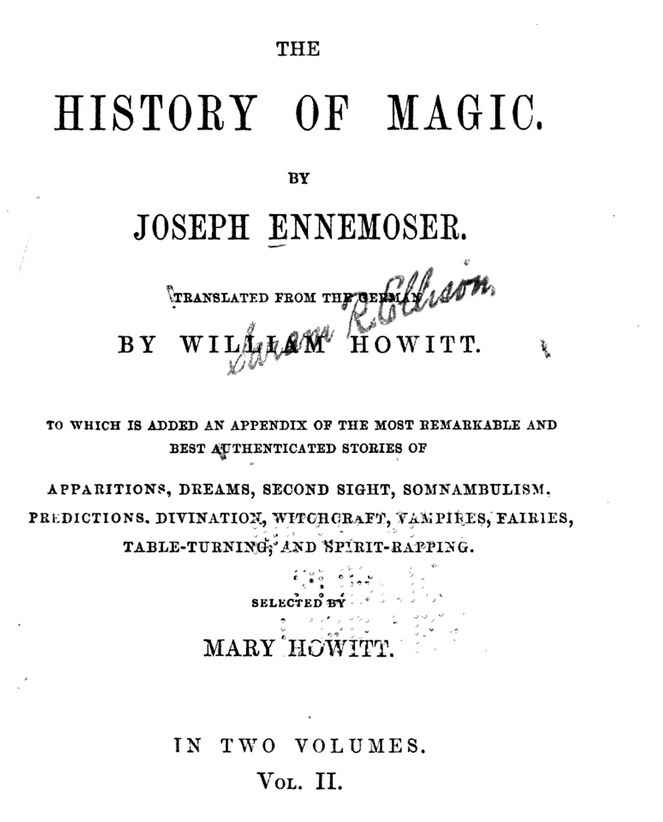 As if to confirm Howitt’s interest in the macabre, a few years later she and her husband — by now a veritable ‘writing-machine’ duo — also popped out a hefty two-volume translation from the German of The History of Magic (1851)…