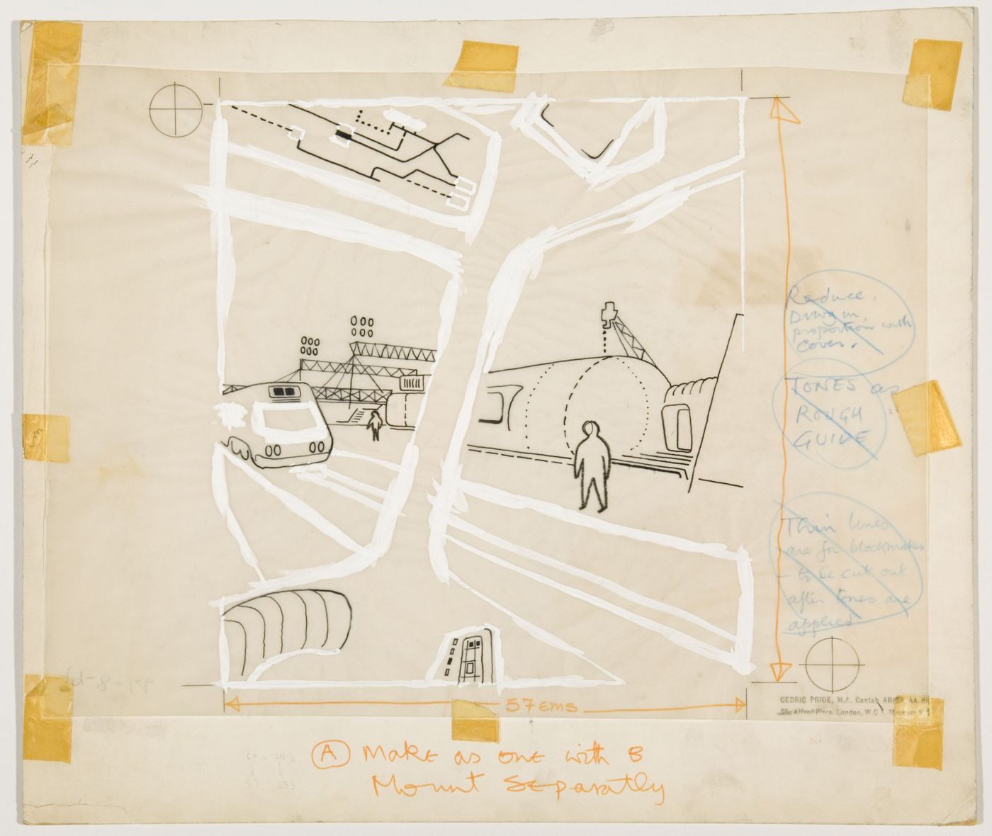 But back in the 1960s Price mused that, if the city could not be saved, perhaps the students could. He proposed four types of uber-modern student housing and classrooms-on-rails, all shuttling students of hard science and engineering around the Potteries, inside newly designed rail-car types named ‘Capsule’, ‘Crate’, ‘Battery’ and ‘Sprawl’. These units would be hermetically sealed, with no windows and with artificial atmospheres, to prevent contact with the dismal city outside. Their trains would be serviced from thirty new custom-built railheads and sidings around the Potteries. The structures would “hot-house” students and staff, forcing them into “new living patterns”. Inflatable structures were also rather hazily mentioned, presumably bouncy-castle style entertainment pods.