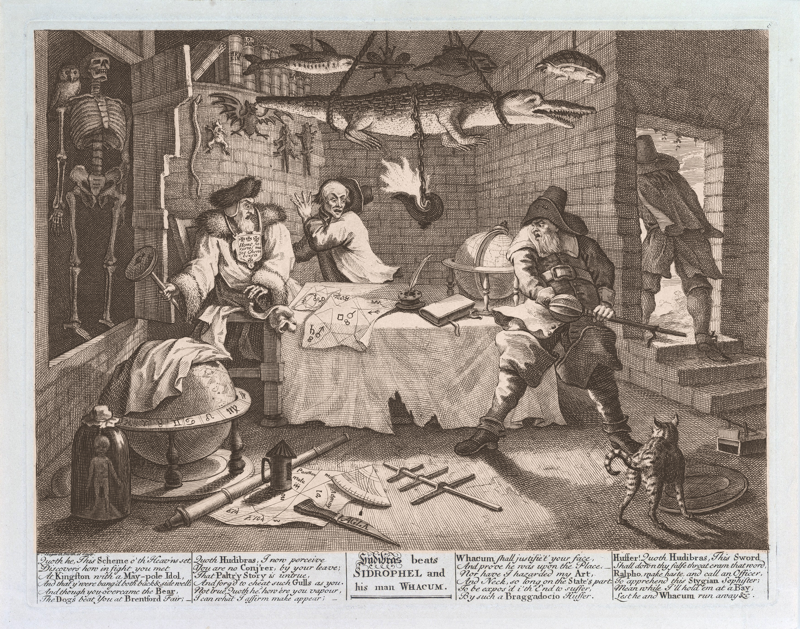 The hero Hudibras wants advice on how best to woo a widow, but first he needs to assure himself the astrologer is ‘the real thing’. The astrologer has got some false information about Hudibras, by a roundabout route, and he feeds the information back to Hudibras in the guise of a supposed astrology reading. Thus the hero knows the astrologer to be a fraud. Hudibras holds them at bay with his sword, while his squire goes to fetch a constable. Illustration for Hudibras.