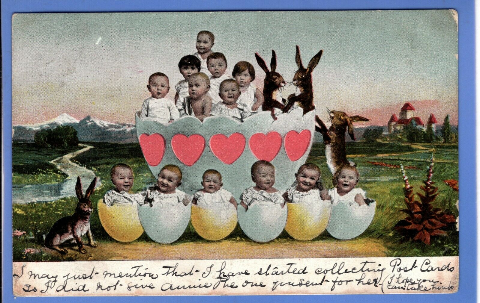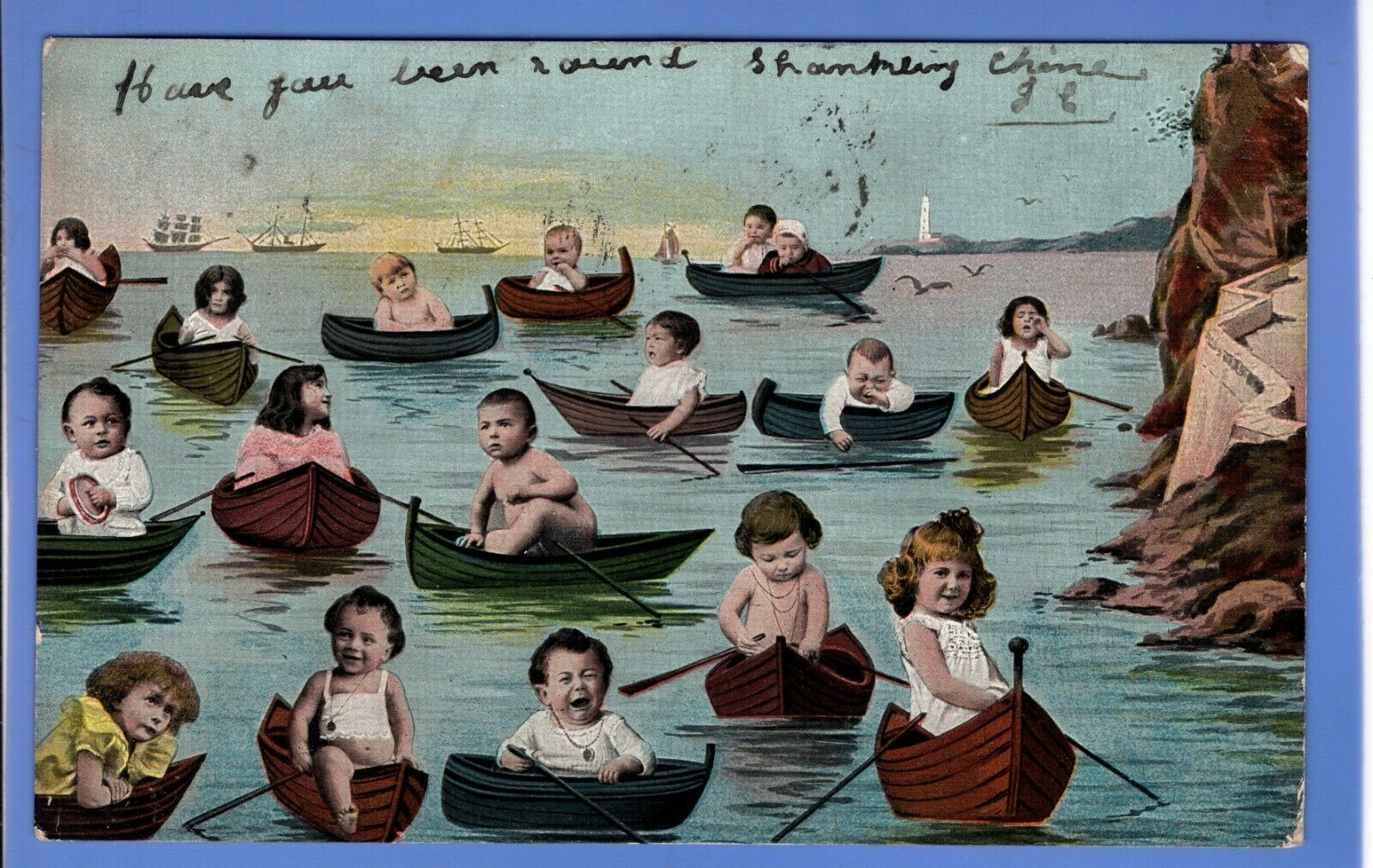 Early examples of photomontage from “Doff Brothers, Manchester”, both postmarked 1905. They show that early commercial photomontage for printed postcards wasn’t just something confined to the agricultural grassroots in America. The Americans were also making folksy cards like this at about the same time, but showing things like giant corn cobs, giant chickens and fish.