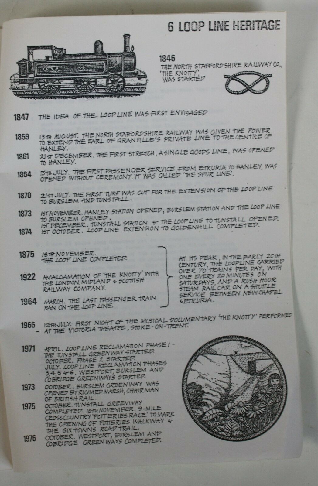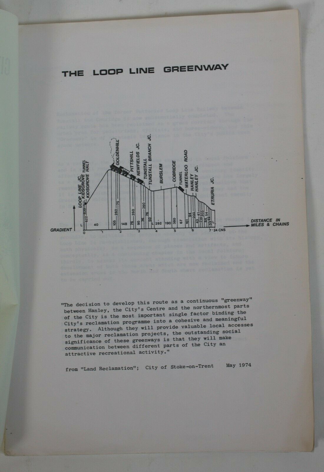 The old Loop Line Apr30 by futurilla Snagged from eBay, some pages from a mid 1970s booklet on the reclamation of the old Potteries Loop Line for pedestrians and cyclists. A pleasing pen-and-ink drawing, map, gradient cross-section, and list of key dates.