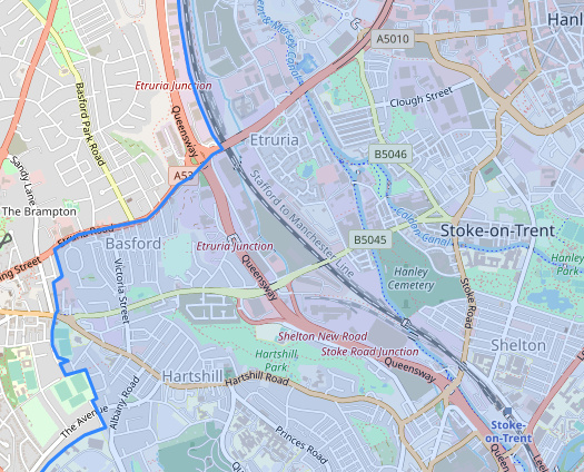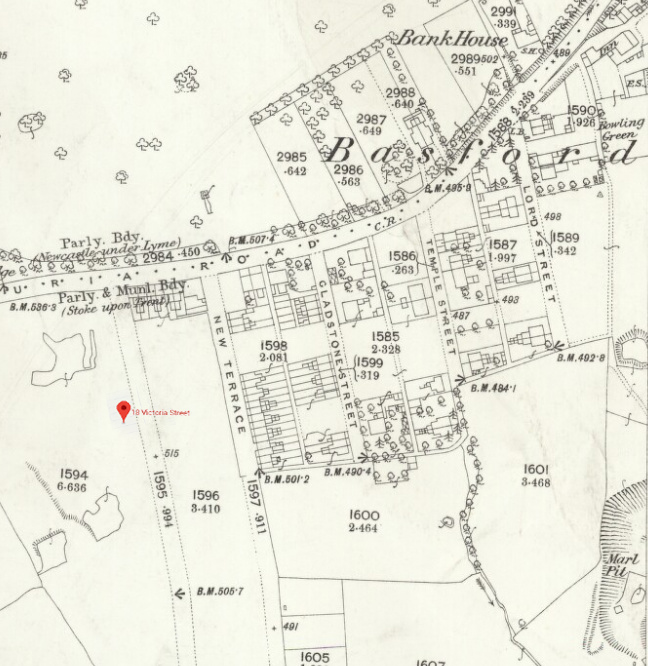 For initial orientation, here is 18 Victoria St., Basford, Stoke-on-Trent, on a modern map. The blue shading indicates the area and boundaries of Stoke-on-Trent. One can see Victoria St., under the “Basford” label.