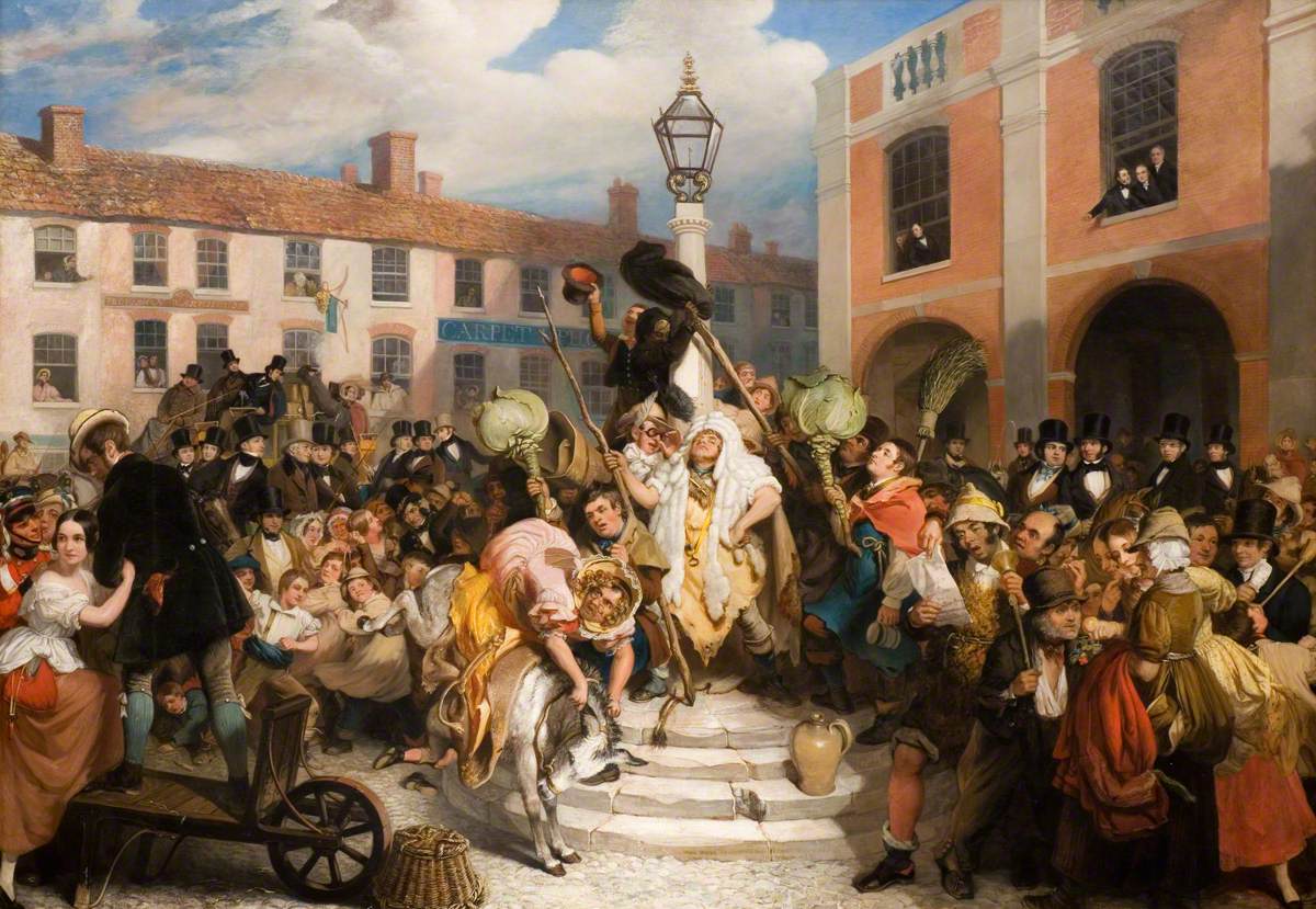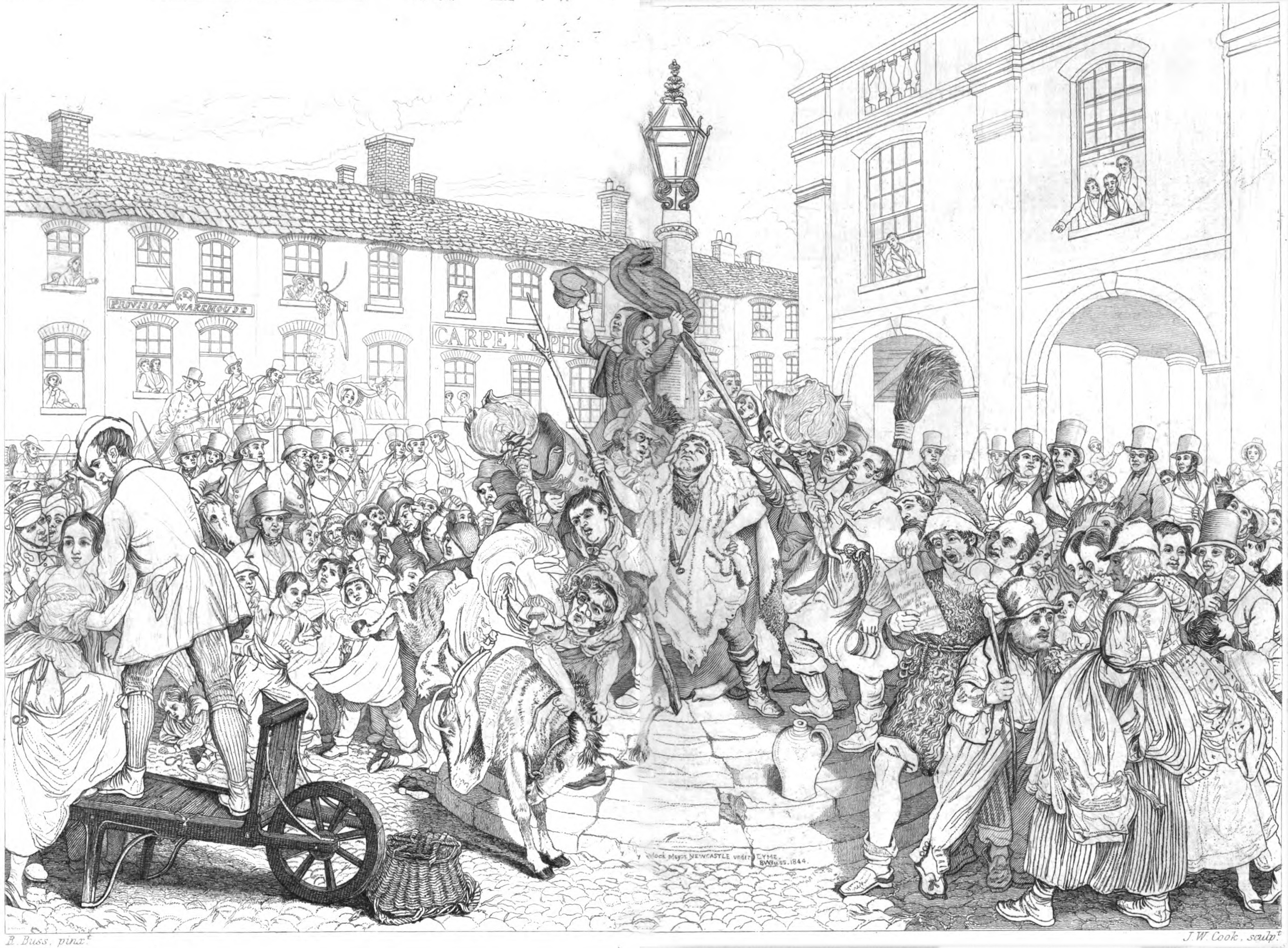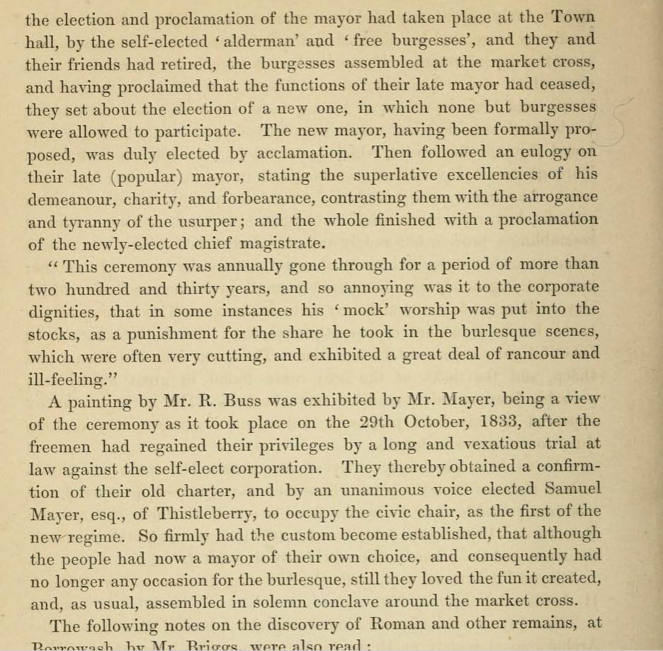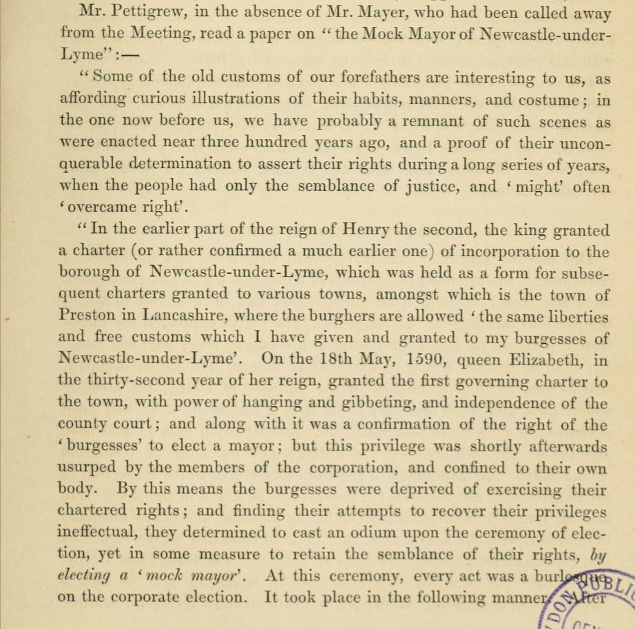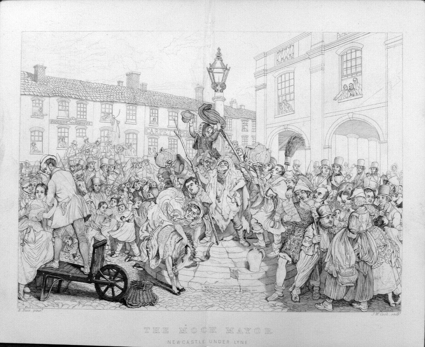 Joseph Mayer, “Account of the Ancient Custom of Electing a Mock-Mayor in Newcastle-under-Lyne”, Transactions of the Historic Society of Lancashire, 1st May 1851. It is rather more lively that the above dry report of it suggests, and has vivid details of the characters and costumes involved.