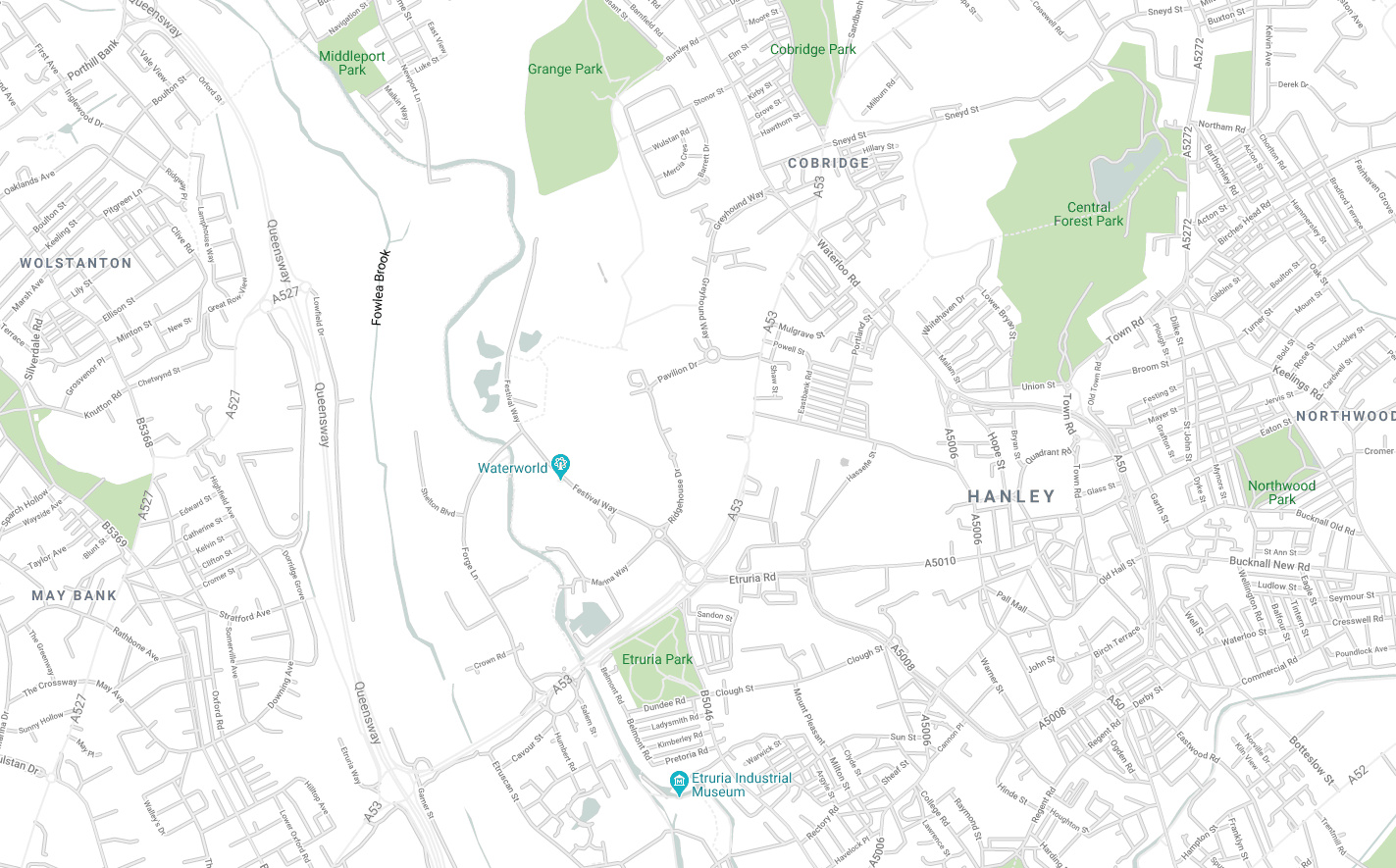 Regrettably only the ‘known to officialdom’ green-spaces are marked, and for instance you can see here that the green bit of Festival Park is not green. That’s because it’s not mown by the local Council, but rather is tended privately by St. Modwen. Thus it’s not on the Council’s GIS maps, and thus “doesn’t exist” when it comes to showing the world the green spaces in the city. But, for a simplified map it’s still pretty good.