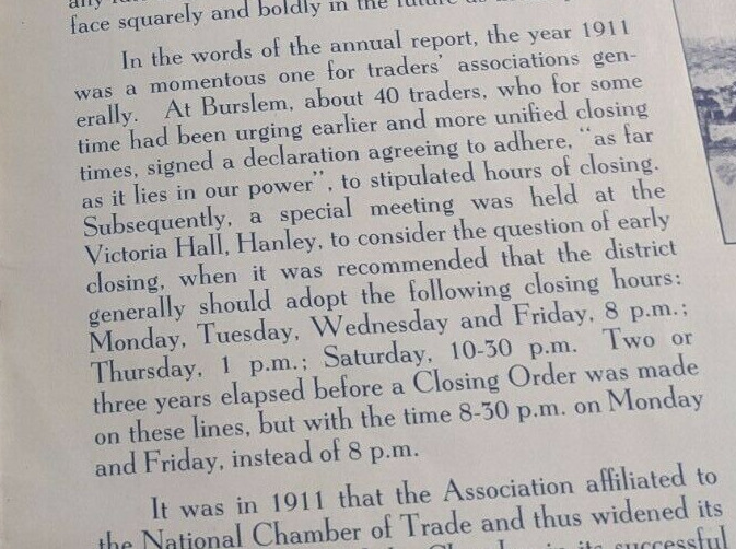 An interesting little snippet of fact, for those writing historical fiction and accounts of Burslem. We might casually assume that a modern 5.30pm closing-time had been norm since the 1860s, but it wasn’t so. Actually the shops, and presumably also the eateries, were open very late into the evening. I guess the attitude was, “if there’s trade to be had, we stay open”.