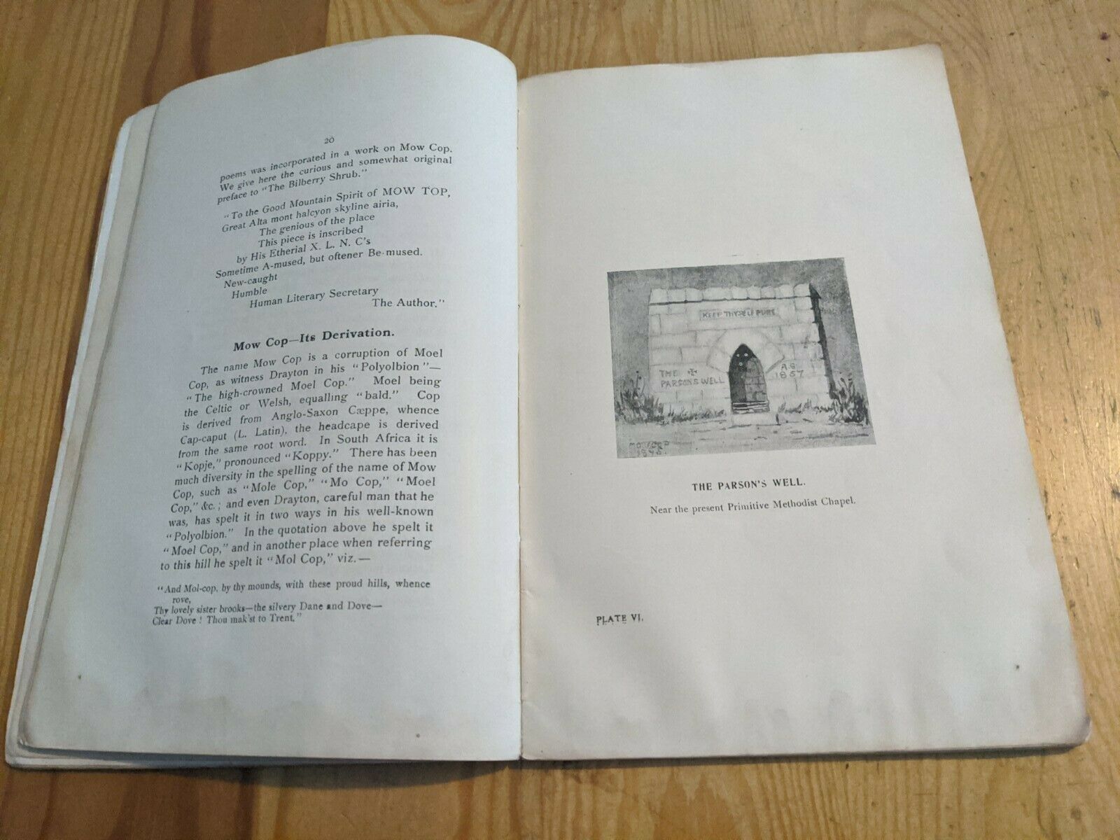 Importantly for local folklore, he recalled that there used to be annual well-dressing ceremonies, and the book shows a drawing of one well. It might have slipped my memory, but I don’t recall that I’d heard anywhere else that there had once been an annual well-dressing event on Mow Cop. There is also a Woodcocks’ Well School on Mow Cop, so that may give another name.