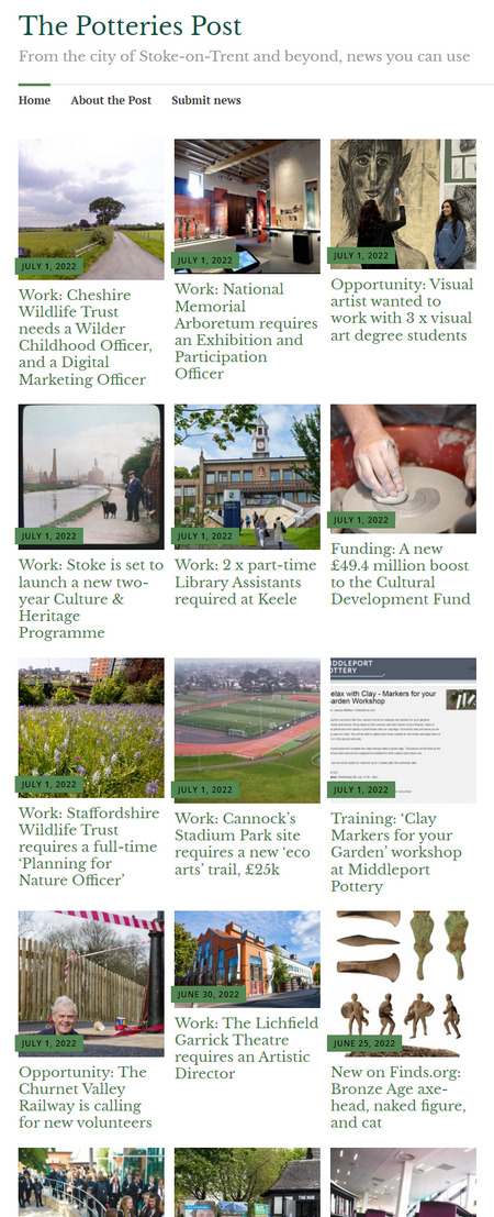 The Potteries Post – From the city of Stoke-on-Trent and beyond, news you can use. Not much local creative / eco news at present, as we’re moving into sleepy August, but there’s still a smattering to be had. The Post will be in “slow mode” for August, and back in early September.