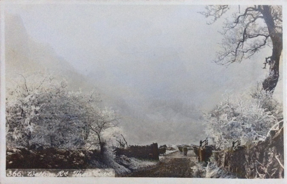 A rare if fuzzy picture of Wetton in winter, perhaps early 1900s since it was posted in 1909. Shows the unpaved track-like Wetton Road with the site of Thor’s Cave indicated in the mist above. Relevant to getting a feel for the setting and season encountered at the conclusion of the poem Sir Gawain and the Green Knight.