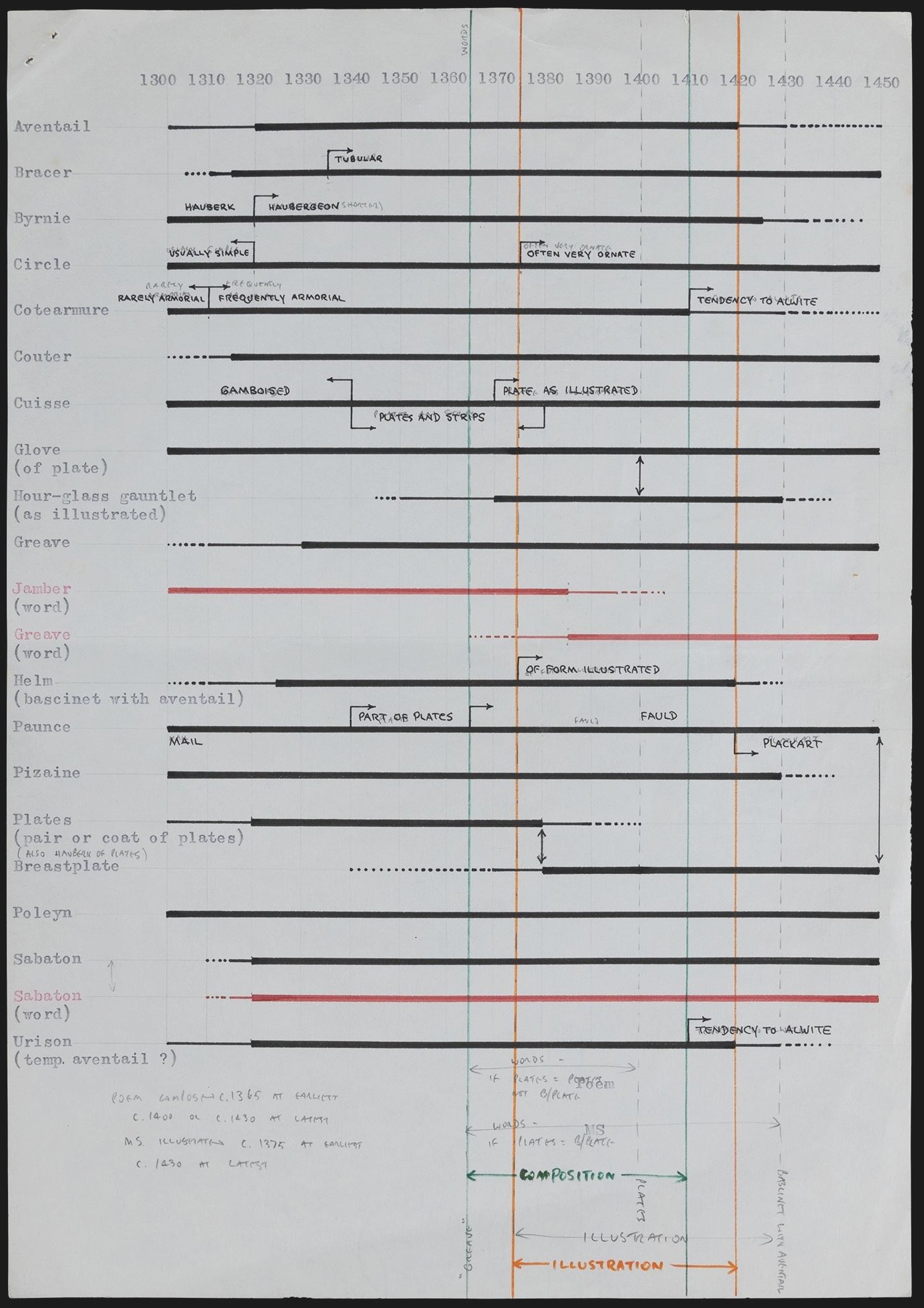 * For sale, “Two Pieces of Correspondence Concerning the Dating of the 14th C. Poem, ‘Sir Gawain and the Green Knight'”, with Tolkien’s initial reply and a useful scan of the armour terms in Gawain placed along a timeline. By that measure “composition” should have been between 1364 and 1410, at least according to the armour specialists of the 1960s (the letter was 1971). My own preferred date would be 1377, for the composition.