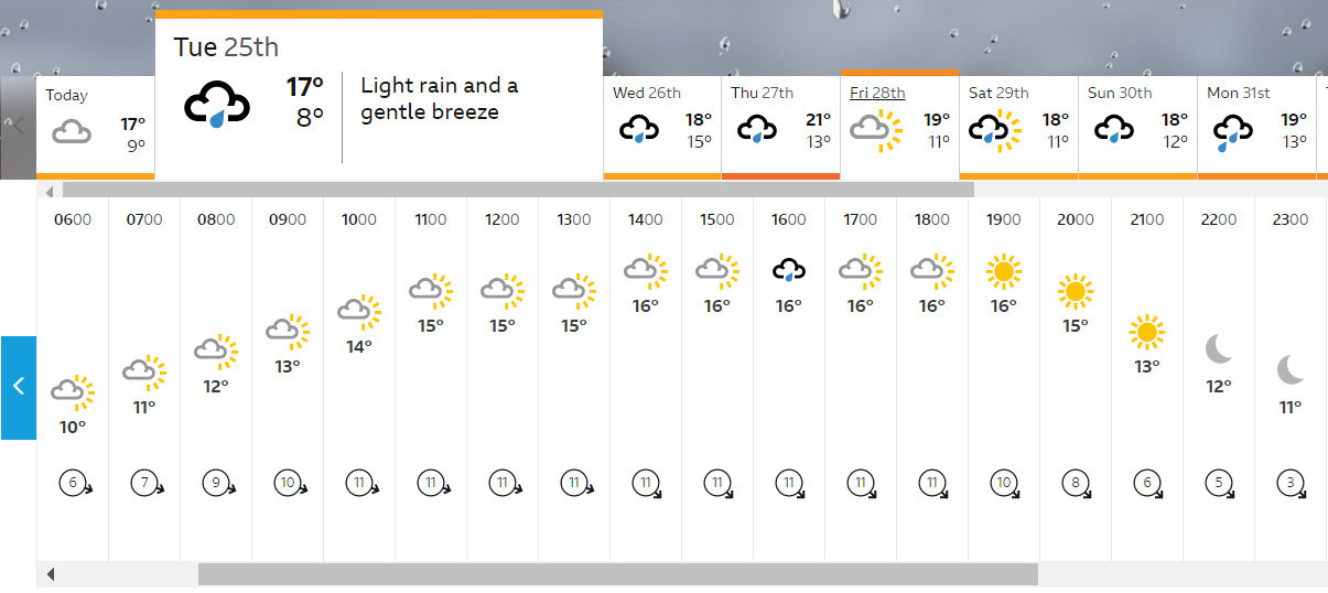 A lovely day, effectively and falsely proclaimed to be “wet all day” by the main icon and description, just because of a few drops of rain at 4pm.