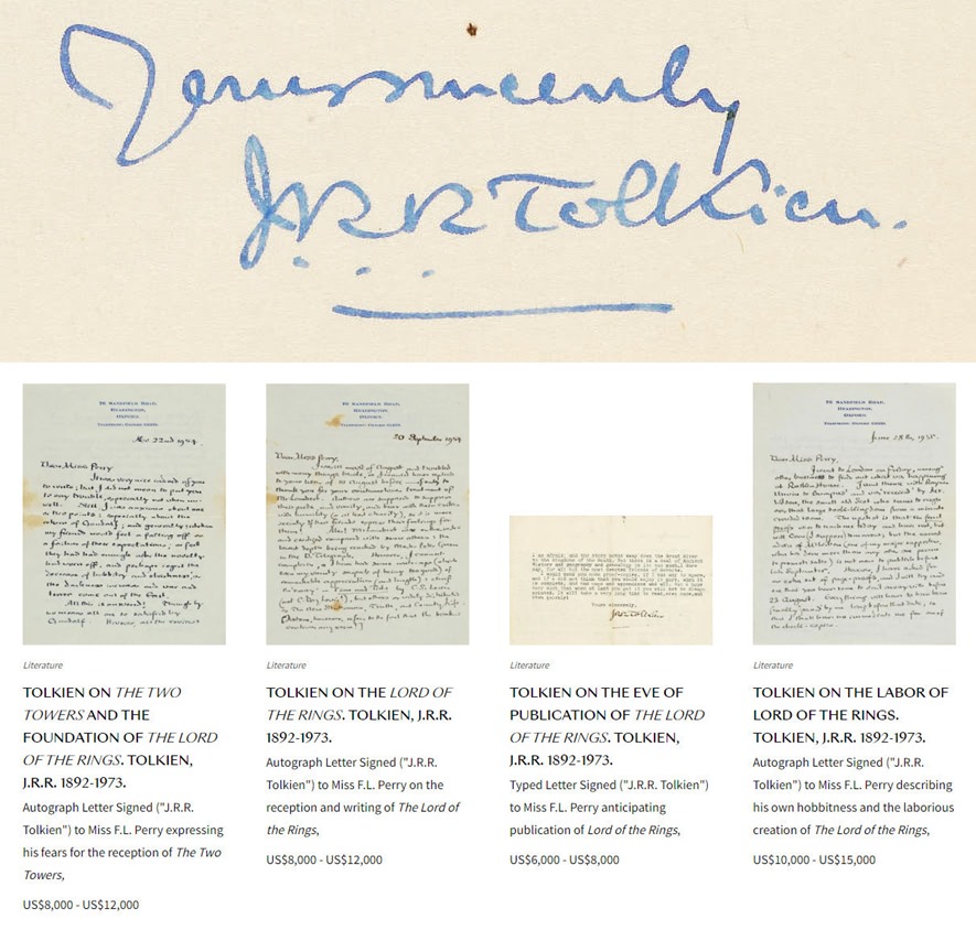 * Some Tolkien letters are coming up for auction on 22nd June 2023, these being the letters to a Miss F.L. Perry and another to a Miss Flint. The Bonhams website now has nice scans online. Right-click and ‘Open image in new tab’, and then zoom, for the largest size.