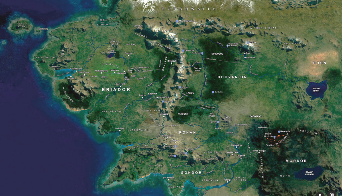 * And finally, a new Google Middle-earth, in the style of Google Earth. The maker says… “I started adding all the names and markdowns in the style of Google Maps using Corel Draw. Took me some days.” The 50Mb “PDF is in CMYK mode and ready for printing.” No Street View, but one imagines someone will cook up an AI for that soon enough, by hooking into one of the more canonical game-worlds. The map’s a touch dark for me on Windows, so I’ve tweaked it a bit in this small preview…