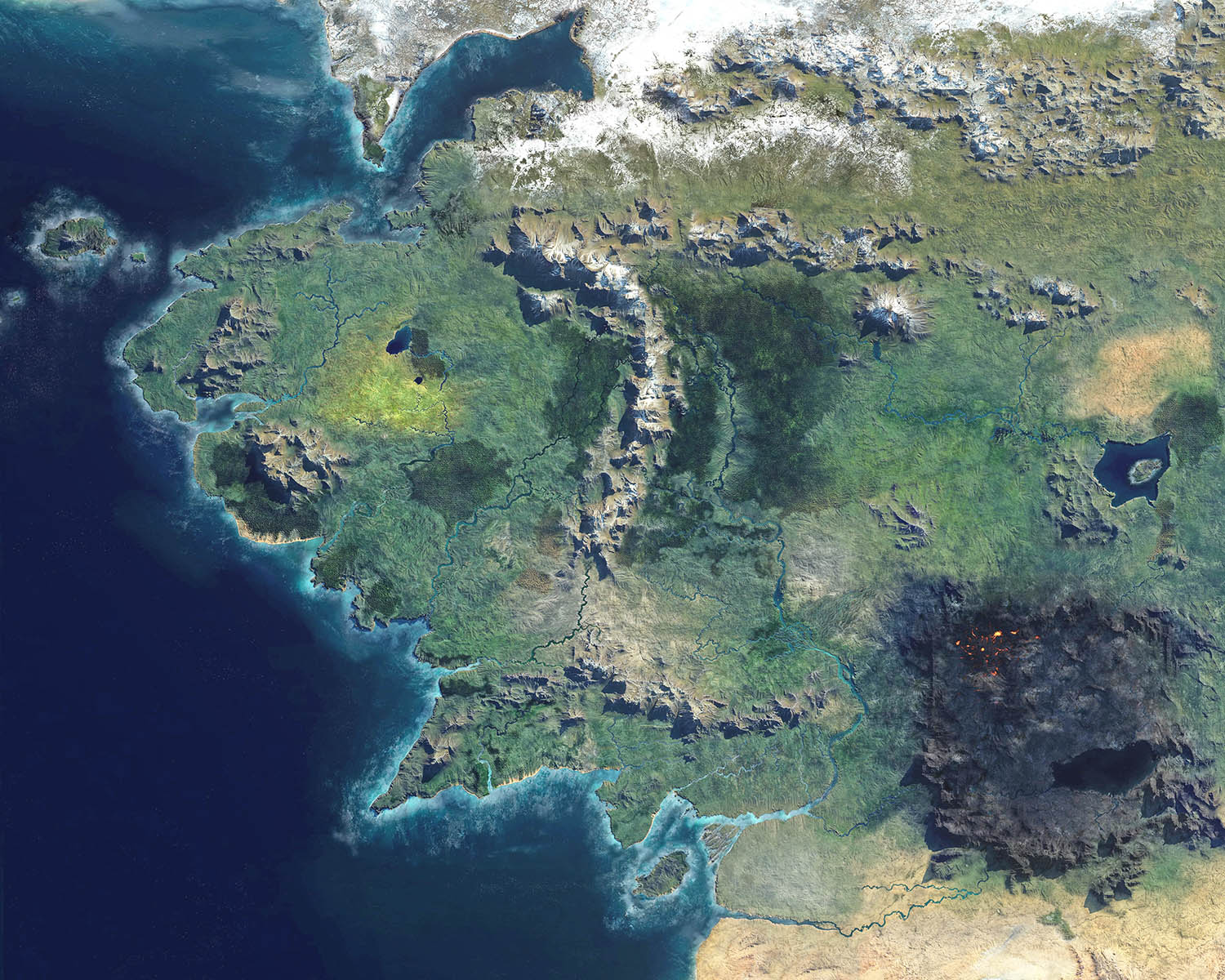 If you want to have a go yourself, the source is here in 5k. It’s made by gamers and described as “the canonical map described by the author”. Though places a forest between Lorien and the Gladden Fields, has the Old Forest be far larger and further south, and adds a large island in the Sea of Rhun. Possibly it’s meant to be earlier in time than Tolkien’s maps? Or perhaps it’s been influenced by games? Still it’s a good starting point, with a few tweaks. Once again it’s very dark and I’ve here tweaked it up in Photoshop…