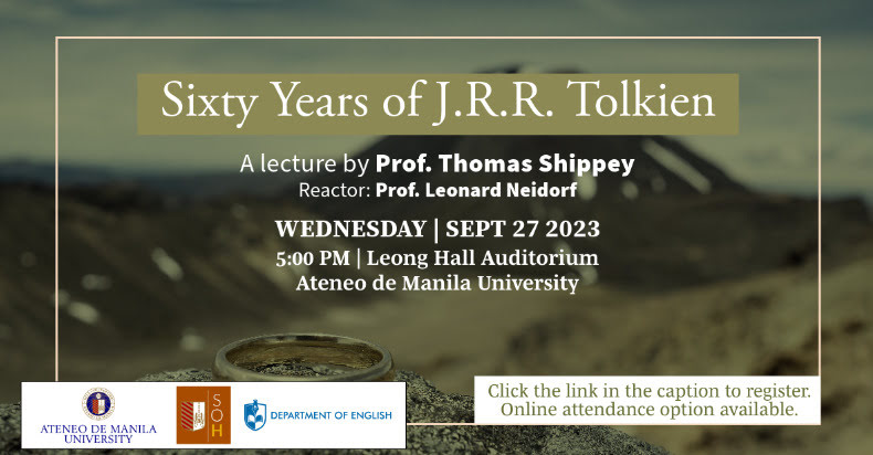 * Ateneo de Manila University’s Events at the School of Humanities this September Web page includes news of a free lecture by the venerable Tom Shippey, titled “Sixty Years of J.R.R. Tolkien”. Set for 27th September 2023. “Online attendance option available”, and booking now. At the Department of English, so I assume it will be given in English.