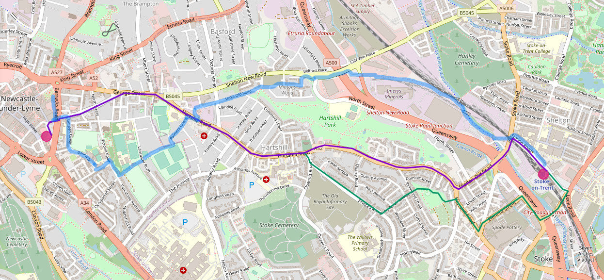 Slow Ways aims to map the best ways to walk from place to place across the UK. Their Stoke to Newcastle-under-Lyme suggestions are awful and don’t inspire any confidence. One would have you trudging alongside traffic and buses all the way on the Hartshill Road. The other is a strange steep dog’s leg to get through to… the Hartshill Road again.