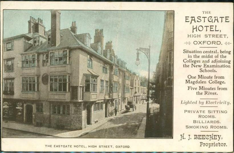 “Tolkien would normally visit the Eastgate Hotel on Merton Street, Oxford, a gloomy inn next to the college where he taught philology while writing The Lord of the Rings. There is [today] something insatiably unhappy about the Eastgate, as if the Boer War[s] were still ongoing. Even so, Tolkien liked it, and he ate there when he lived next door at No. 21.”
