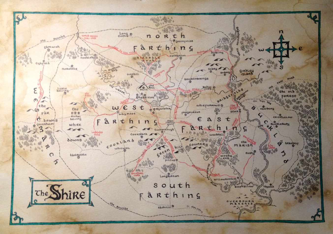 * And finally, a pleasingly crafted envisioning of Bilbo’s wall-map with his favourite Shire walks marked on it in red ink.