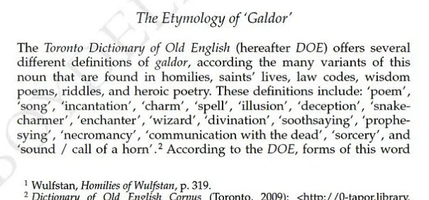 * The new-ish book Charms, Liturgies, and Secret Rites in Early Medieval England (2018) is this weekend highlighted on medievalists.net, and the free sample there throws light on the name Galdor. Via the book’s first chapter on “Anglo-Saxon Understandings of Galdor”. You’ll of course recall the sceptical elf-lord at The Council of Elrond, named as ‘Galdor of the Havens’.