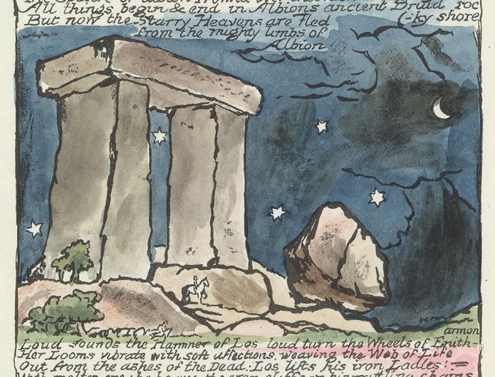 From Blake’s Milton a Poem in 2 books, detail from plate 4. The subject on the right of the painting is a balanced rock, but at first glance could also very easily be read as a ship having just descended from sailing among the stars. Tolkien read Blake’s prophetic books in February 1919.