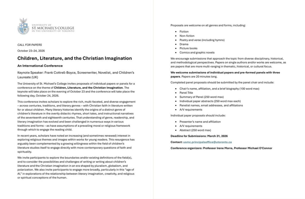 * A call for papers for a conference on ‘Children, Literature, and the Christian Imagination’, 23rd-24th October 2026 at the University of Toronto, Canada. Submission deadline: 31st March 2026.