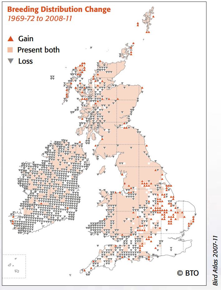 The use of the word “Loss” on this map is somewhat misleading. “Decline” would be a better word, since otherwise one might look at the map and think that the North Staffordshire curlews had been totally “lost” and gone, whereas they are actually still there — albeit with a decline in the breeding population by about two-thirds from the 1910s.