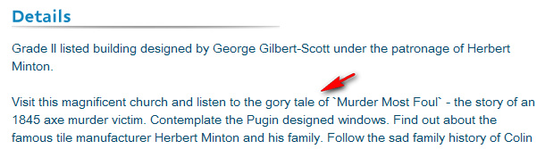 “Visit this magnificent church and listen to the gory tale of ‘Murder Most Foul’ – the story of an 1845 axe murder victim.”
