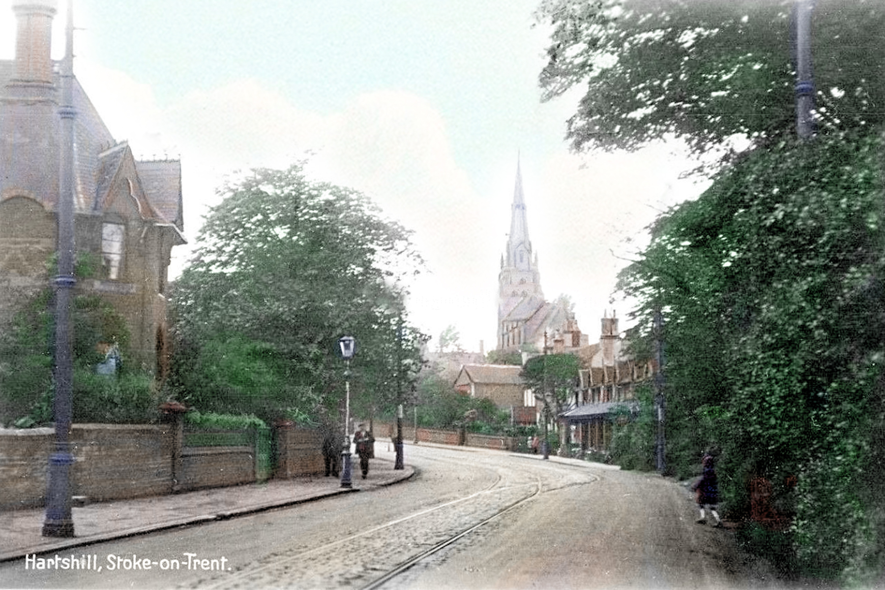 Here is a view of some of the local people Holy Trinity would have served in the 1900s. The main-road gates of both the church and the vicarage are seen on the right of the picture, and the camera looks toward Newcastle-under-Lyme. Tram-stops are just out of sight on either side of the camera.