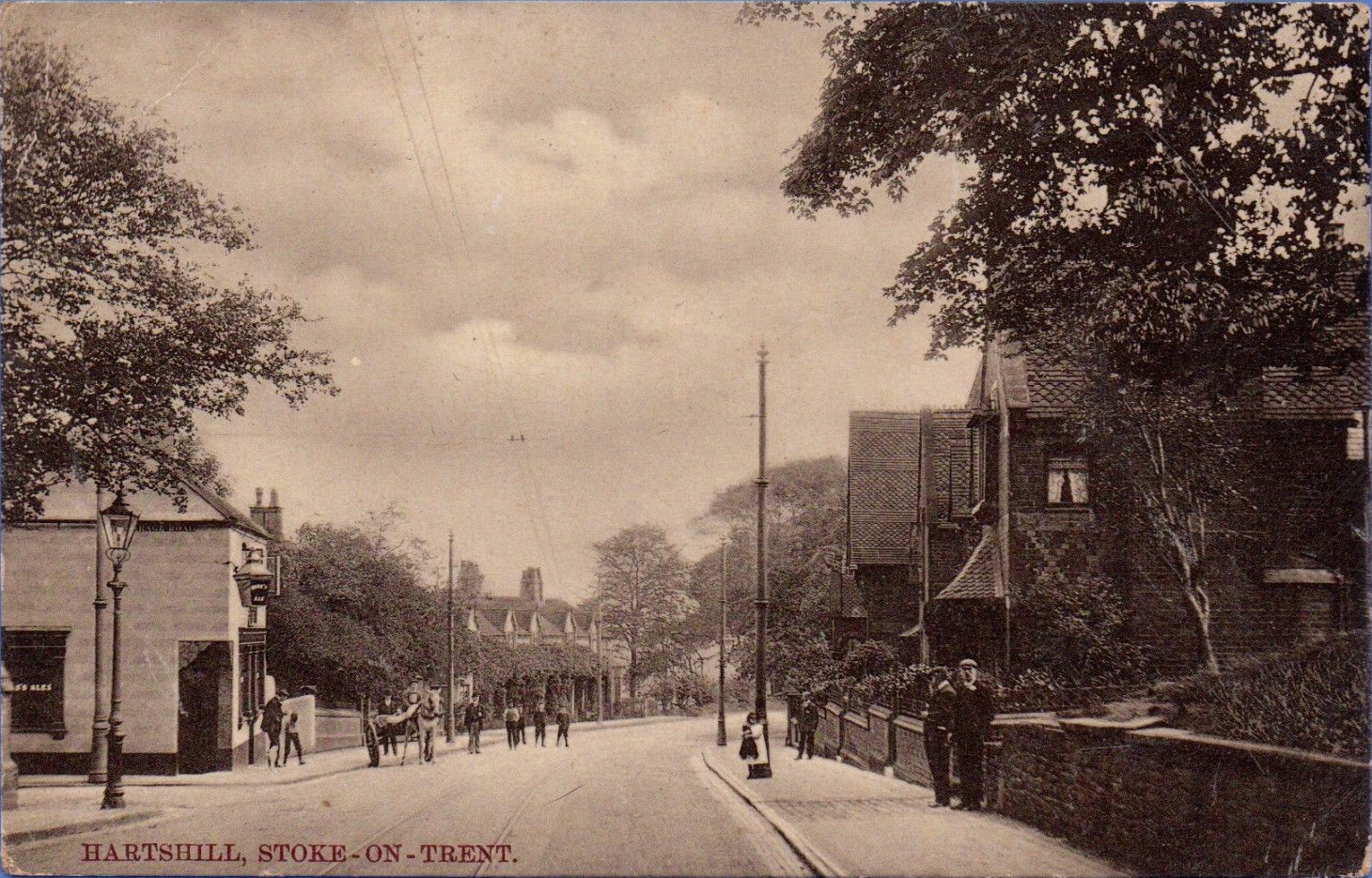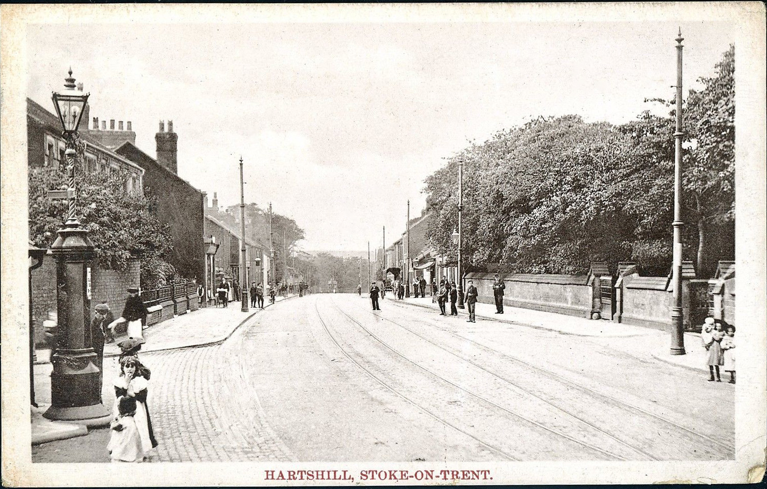 Here is a view of some of the local people Holy Trinity would have served in the 1900s. The main-road gates of both the church and the vicarage are seen on the right of the picture, and the camera looks toward Newcastle-under-Lyme. Tram-stops are just out of sight on either side of the camera.