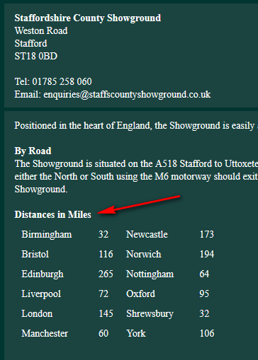 Why does the Staffordshire County Showground website (just east of Stafford) completely ignore Stoke-on-Trent? The distance in miles on the ‘Location’ page makes no indication of how near it is to the city. And according to a Google site: search the nearest the website as a whole comes to mentioning the city is that it has a tickets agent at John Rice Motors at Blythe Bridge, and that one old event had “guest speakers from the National Farmers Union, Stoke-on-Trent and Staffordshire LEP and the Country Land and Business Association”. That’s it.
