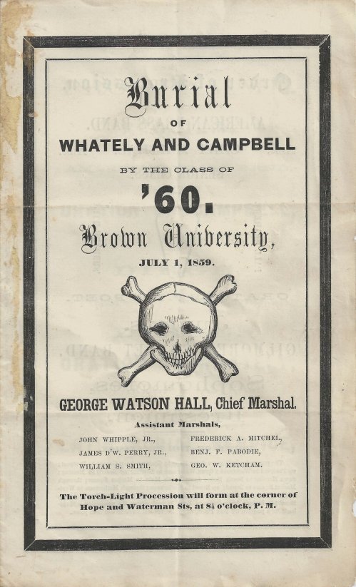 “…[the] earliest known program [for the “Junior Burials”] being for the year 1853. On these occasions there was a procession through the city streets with a brass band, banners and burning torches, as the rhetoric textbooks of Richard Whately, George Campbell, and William Spalding were conveyed in a coffin to Ferry Wharf [Fox Point, Providence, at the confluence of the Seekonk and Providence Rivers]. There the students embarked in boats to an offshore spot where the funeral ceremonies were conducted, complete with orations on the textbook authors, a poem and an ode, and the books were thrown overboard [sealed in a coffin].” (Encyclopedia Brunoniana)