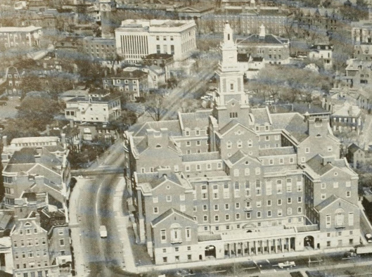 This 1946 view, looking west from a similar spot at the top of College Hill but this time looking through the elm trees, is also indicative. The roof of the John Hay Library is seen on the right of the picture, and the Industrial Trust building can just be seen in the distance on the left.