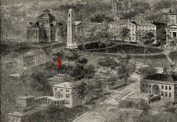 Below is the bird’s-eye scene seen the other way, looking at the vantage point from which the above 1959 telephoto picture was made. Here it’s 1962 and the building being torn down is opposite the Van Wickle gate and on the opposite corner to the John Hay Library (top of College St.).