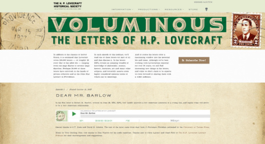 The H.P. Lovecraft Historical Society are posting Lovecraft letters, as audio readings. The first in the “Voluminous” ongoing podcast is his short opening letter to Robert Barlow, which runs 24 minutes with additional discussion before and after by Sean Branney and Andrew Leman of the Historical Society. The actual letter starts at 9:50 minutes in, if you want to skip introductory stuff you already know, and is from the book O Fortunate Floridian: H. P. Lovecraft’s Letters to R. H. Barlow.
