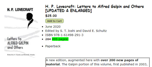 These will contain the long-awaited complete set of letters from Lovecraft to his aunts. Looking at the Hippocampus website, I see that the new H. P. Lovecraft: Letters to Alfred Galpin and Others [UPDATED & ENLARGED] is now available for order.